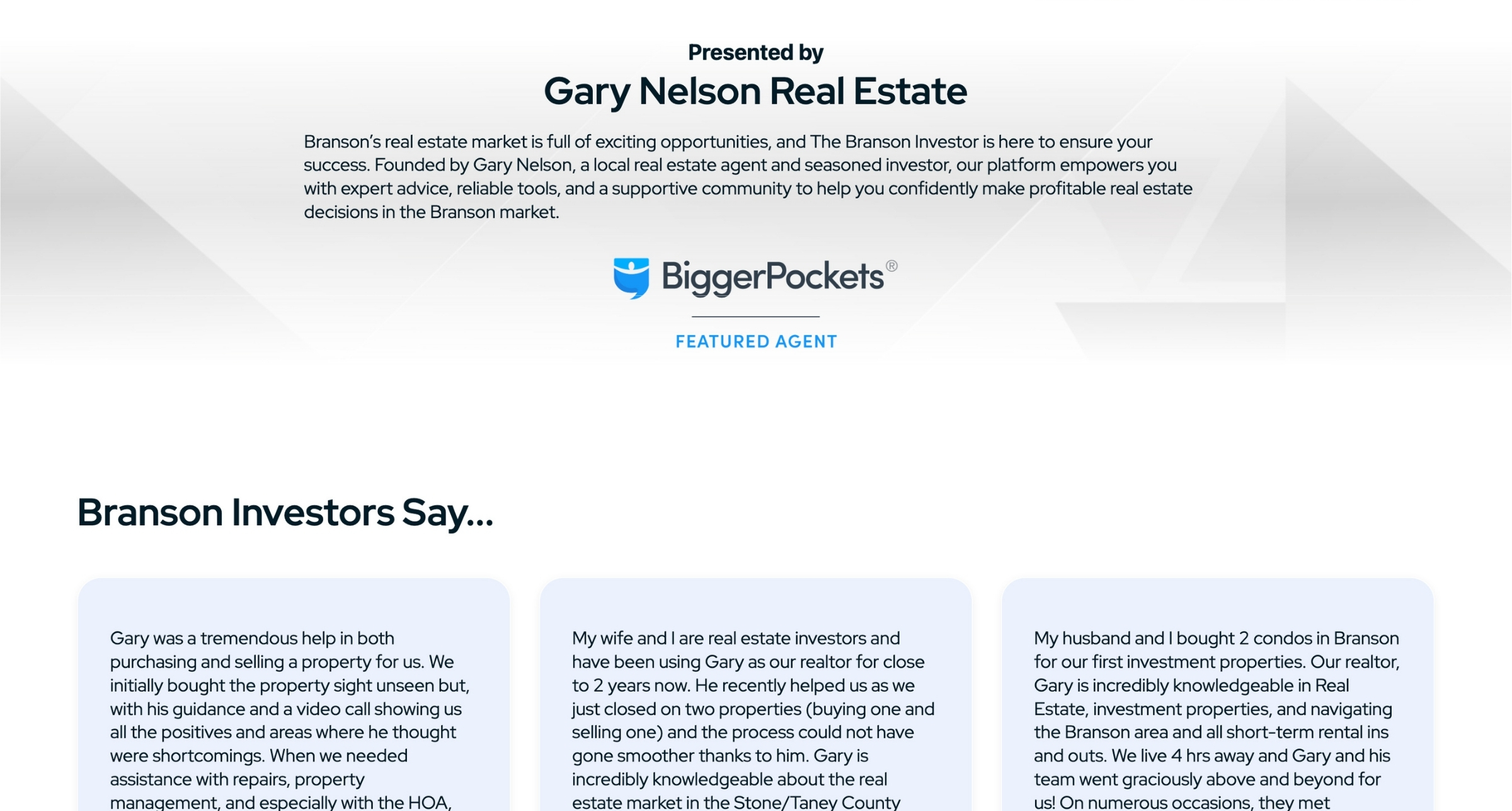 Gary wanted to create a space where Branson real estate investors could feel informed, and supported, not just sold to. There wasn’t a central place that brought together local insight, shared context, and a sense of community around the Branson investor market. I built The Branson Investor as a dedicated hub where education, location awareness, and strategy live side by side, giving investors a place to learn and engage on their own terms. The site was designed to grow with the community over time.